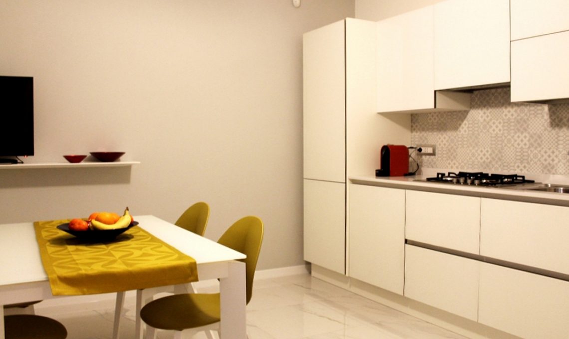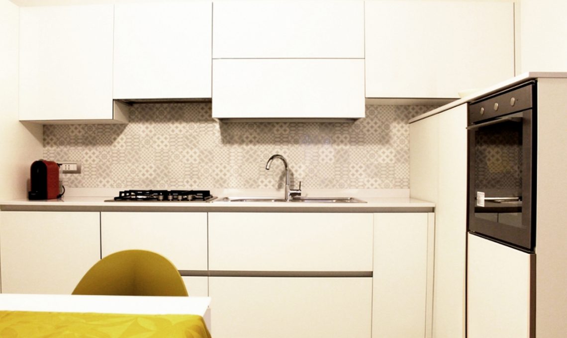• La cucina è stata totalmente rinnovata: le pareti ora sono dipinte in grigio chiaro e tra basi e pensili c'è una fascia di piastrelle cementine sempre in bianco e grigio. Donano un  tocco di colore le sedie in tonalità senape attorno al tavolo.