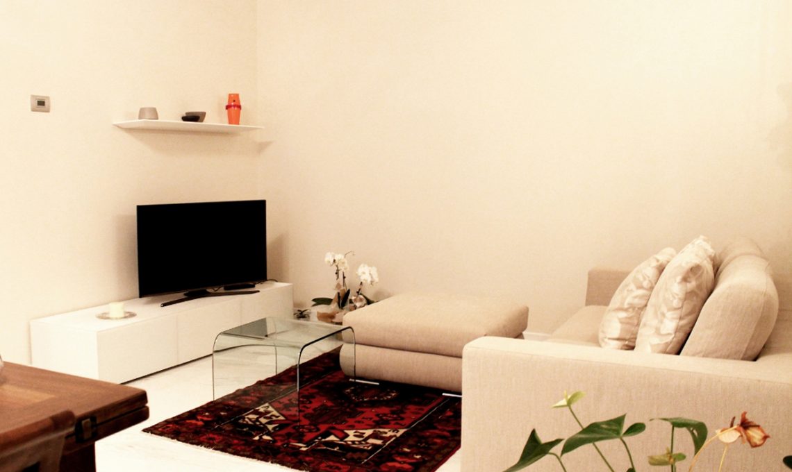 • Il soggiorno, con la demolizione di parte della parete che lo separava dall'ingresso, ora appare più spazioso grazie anche alla tinteggiatura color sabbia dei muri.