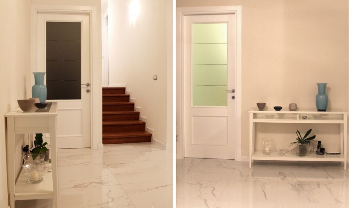 • Bianco e grigio chiaro dominano in casa: ora tutti gli ambienti sono più luminosi ed eleganti. A terra è stato posato un pavimento in grès da cm 60x60 effetto marmo calacatta e le porte esistenti sono state restaurate e laccate in bianco.