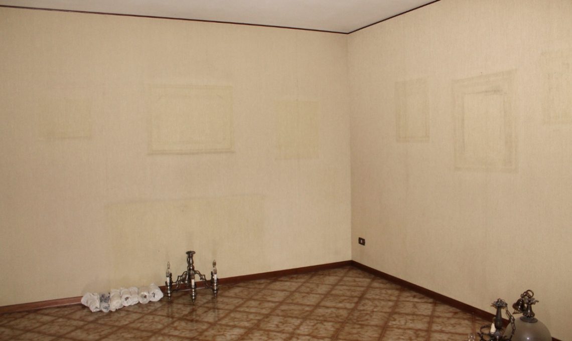 • Le pareti del soggiorno erano rivestite in carta da parati, i pavimenti in vecchie piastrelle presenti praticamente in tutta la casa.