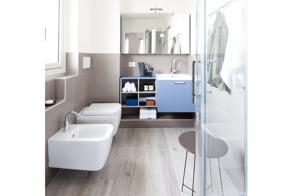 Vaso e bidet, dopo il restyling sono stati affiancati tra di loro; si tratta dei sanitari Stone sospesi [Ceramica Globo, cm 36x45 da €312 cad] con rubinetto [Cristina Rubinetterie].