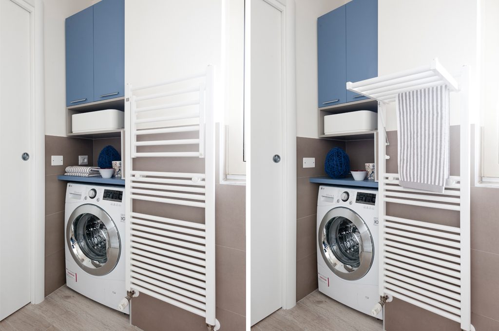 La zona lavanderia, ricavata là dove prima c'era la 'testata' della vasca da bagno è organizzata con il mobile per lavatrice Kyros [Edoné, cm 60x60x220h €818] e lo scaldasalviette-stendino Dinamic [Deltacalor da €188].