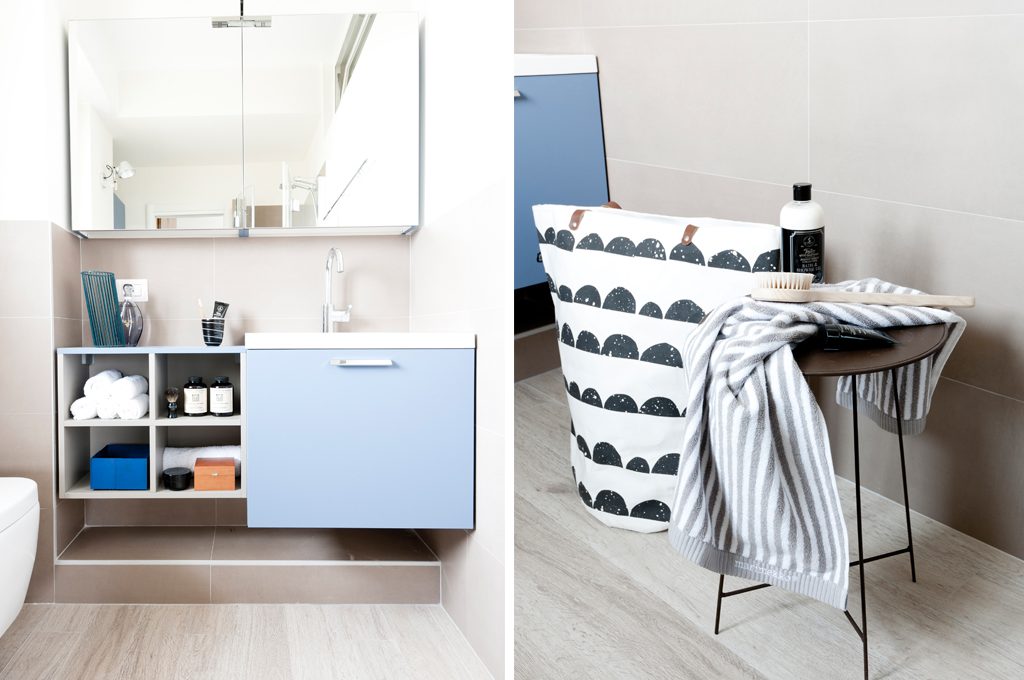 Il bagno padronale di un trilocale aveva bisogno di essere ristrutturato perché ormai vecchio. Così la nostra stylist Marta Meda ha pensato di renderlo a uso esclusivo della camera matrimoniale (cosa possibile perché in casa c’era un secondo servizio). Eliminando la vasca e spostando la porta su uno dei lati minori, ora è molto più funzionale con una grande doccia, una colonna attrezzata per la lavatrice, i sanitari allineati e un nuovo mobile lavabo. Il tutto gioca su una palette di grigi e azzurri: très chic!