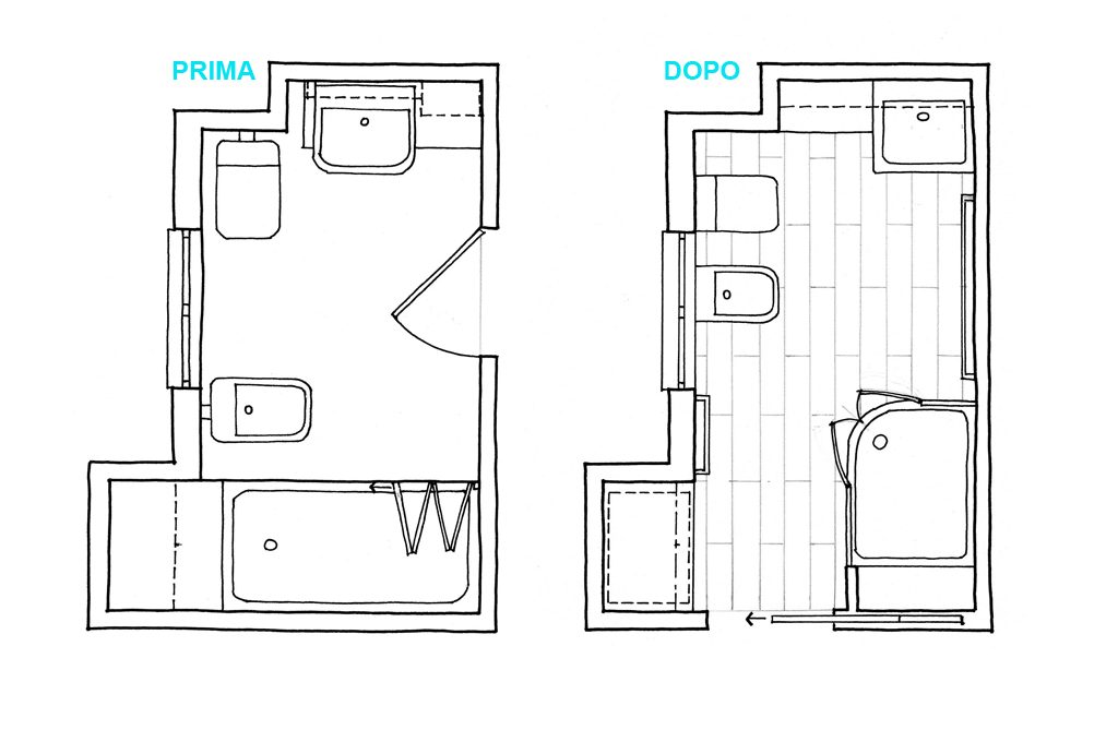 Il locale rettangolare ha due sporgenze in cui sono inseriti mobile bagno e vasca; i sanitari erano disposti a L tra di loro. Tolta la vasca, la porta si è spostata sul lato minore con da una parte la doccia e dall’altra la zona lavanderia; vaso e bidet sono stati avvicinati e allineati. Il mobile lavabo è stato sostituito da un modello più funzionale. [Disegni Michela Savio]