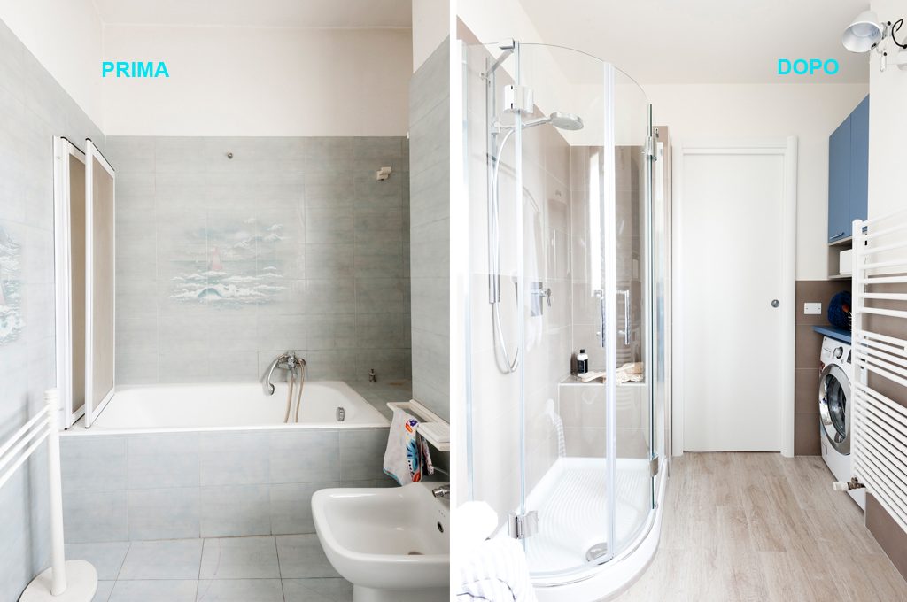 Via la vasca, si sposta la porta: adesso c’è spazio per una maxi-doccia e una zona lavanderia. Un prima e dopo da copiare, in bianco, azzurro e grigio