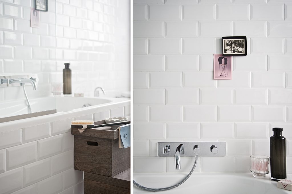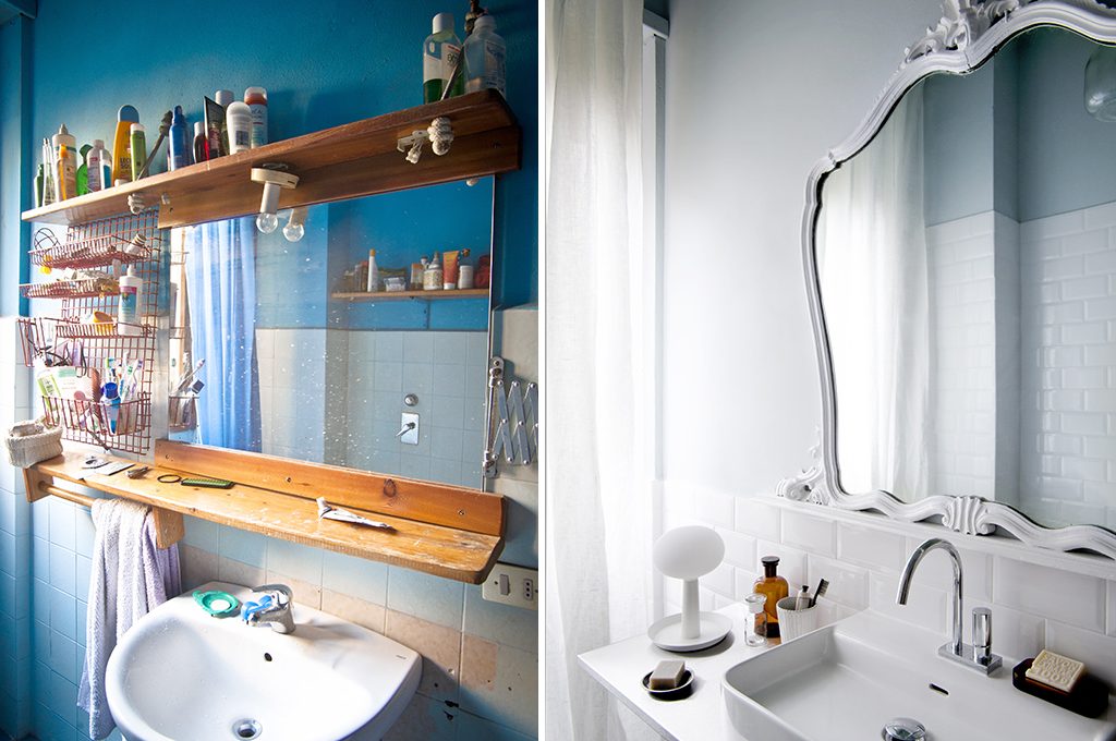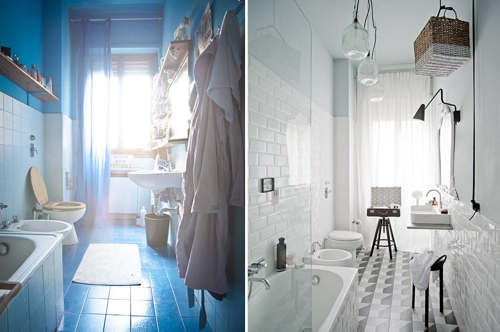 Un bagno nello stato originale risalente agli Anni ’60: un ambiente lungo e stretto, con poca luce e dai colori ‘pesanti’, con vasca e sanitari su un lato e lavandino sull’altro.