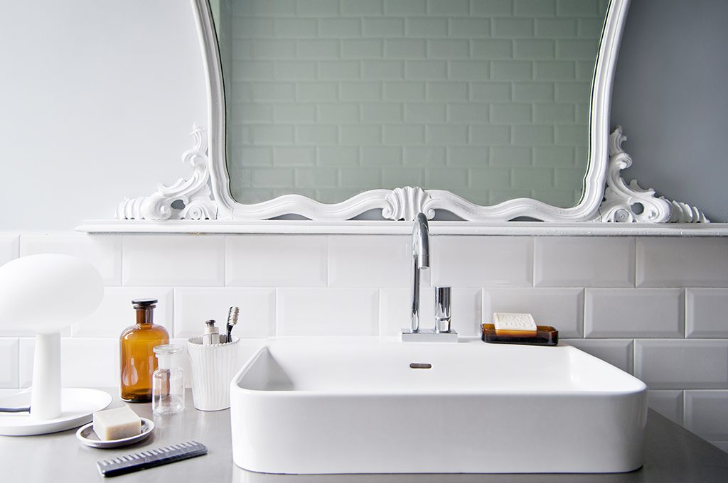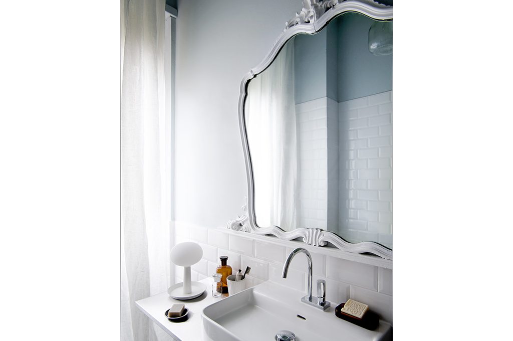 specchiera trovata in un mercatino si trasforma: passa la cornice con carta vetrata ed elimina la polvere con un panno. Rivesti lo specchio con fogli di giornale per proteggerlo dalla vernice. Dai due mani di smalto acrilico opaco bianco sulla cornice usando un pennello piccolo. Quando è perfettamente asciutto, fissa lo specchio a parete.