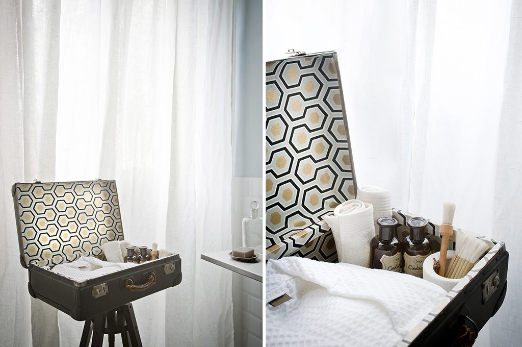 romantico contenitore per asciugamani e prodotti. Dopo aver rimosso polvere ed eventuale sporco dalla valigia, colora l'esterno con la vernice spray e lascia asciugare. Scegli e taglia in misura la tappezzeria per foderare l'interno. Mixa colla vinilica e acqua in parti uguali. Inumidisci la carta, spennellala di colla e applica la carta all'interno della valigia stando attenta a non lasciare bolle d'aria.