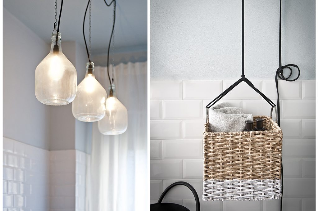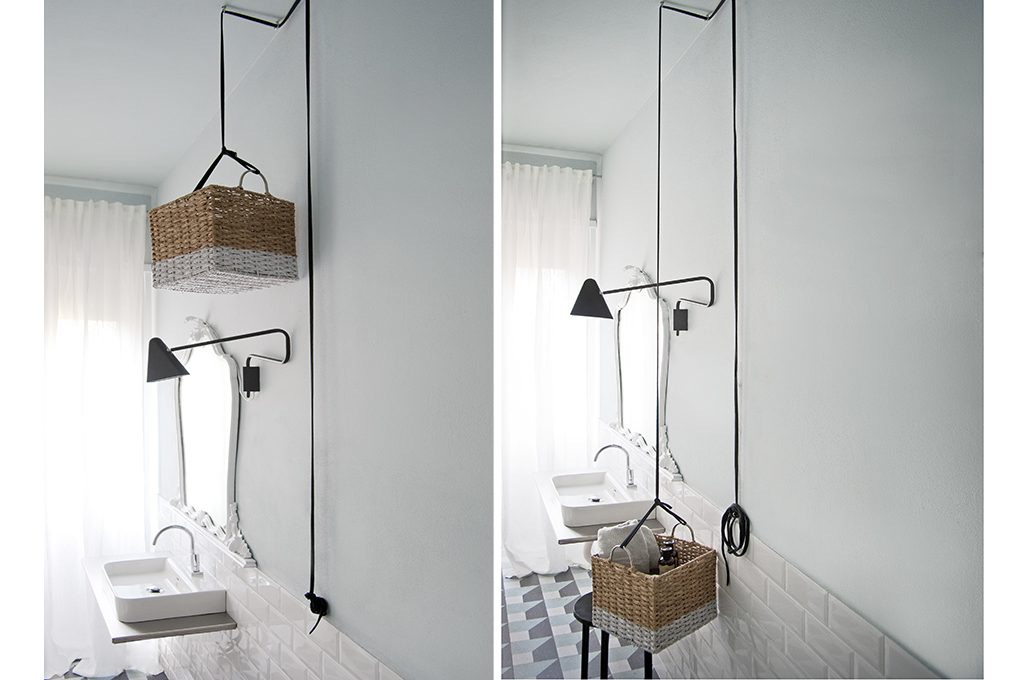 vecchio cestino in vimini? Rendilo un portaoggetti ‘a scomparsa’ con un sistema saliscendi. Lega attorno ai manici una corda, o una fettuccia spessa, che farai passare in 3 anelli fissati a soffitto (così il cesto non rischia di toccare la parete) e in uno avvitato nel muro, in basso, dove farai un nodo per fermare il tutto.