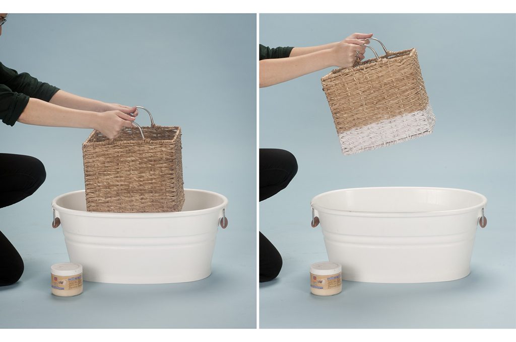 Impermealizzane il fondo: versa circa 2 litri di lattice bianco liquido, diluito con acqua, in un catino e immergi il cesto tenendolo per i manici. Quindi, estrai il cestino e lascialo asciugare perfettamente tenendolo capovolto su un giornale.