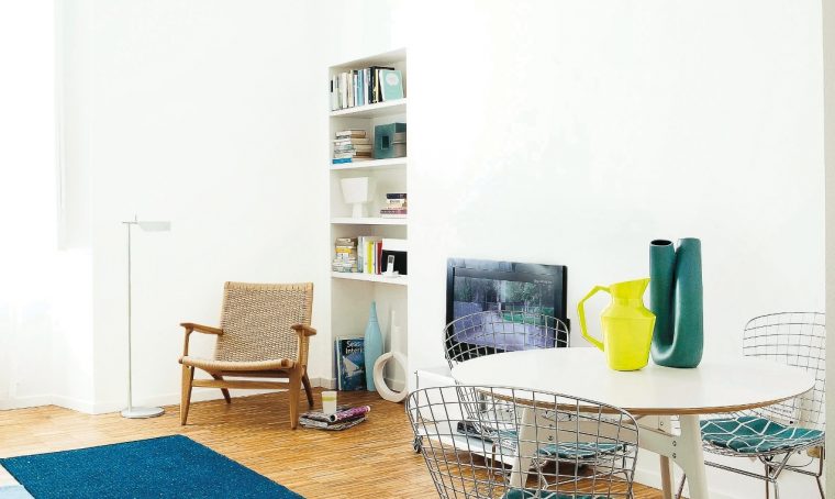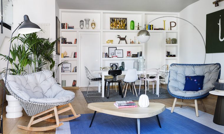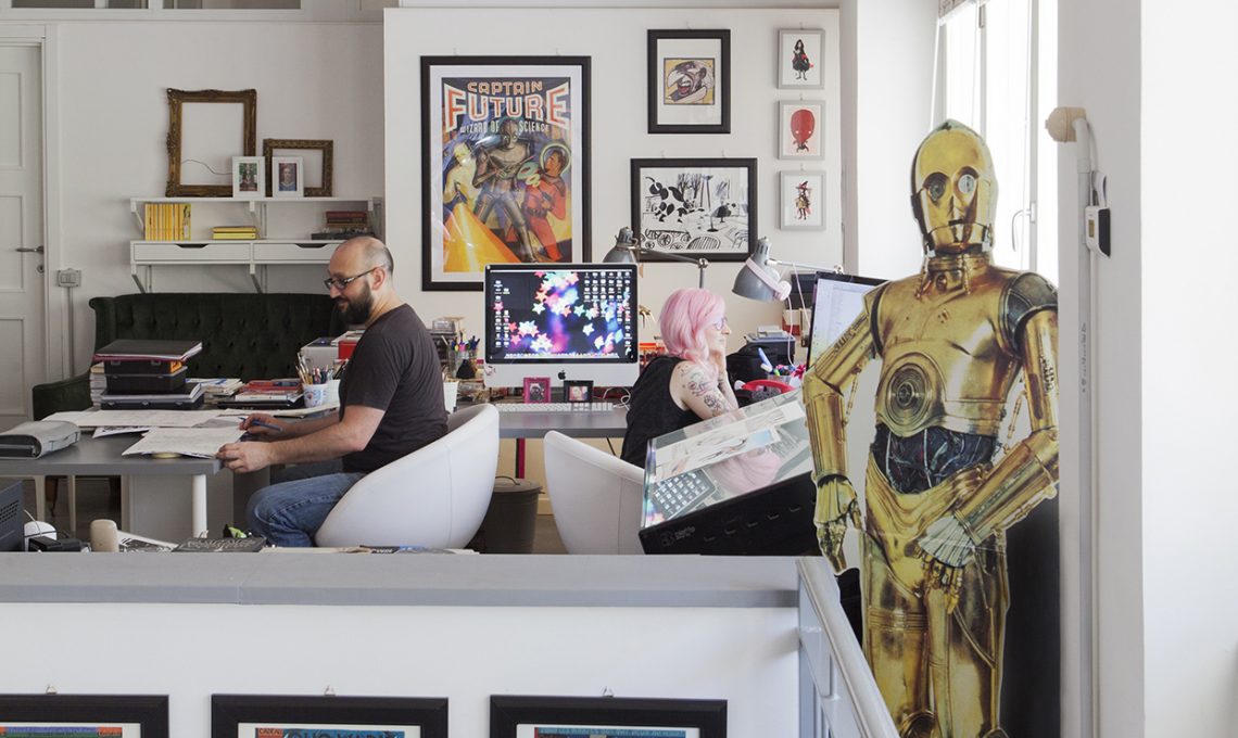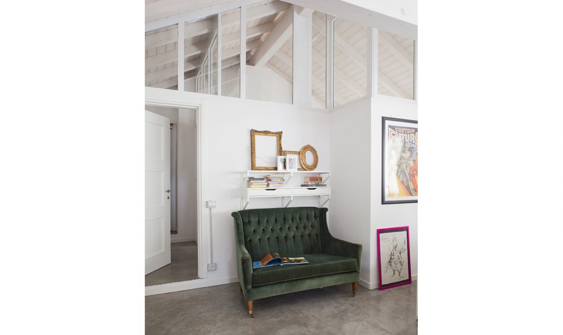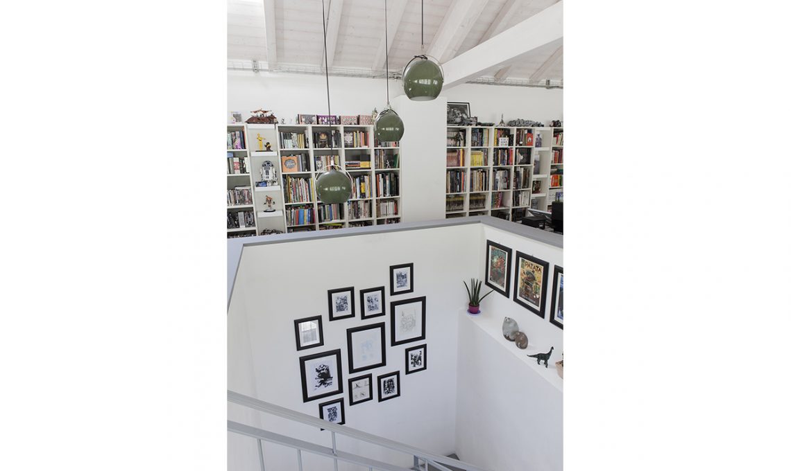 La vista corre libera da un lato all’altro della casa: il soffitto alto e arioso, dipinto di bianco, regala sempre la luce ideale per lavorare senza stress e con la giusta ispirazione. Come décor, tanti poster originali e colorati scovati in giro per mostre e convention. Un perfetto mix fra casa giovane e studio creativo.