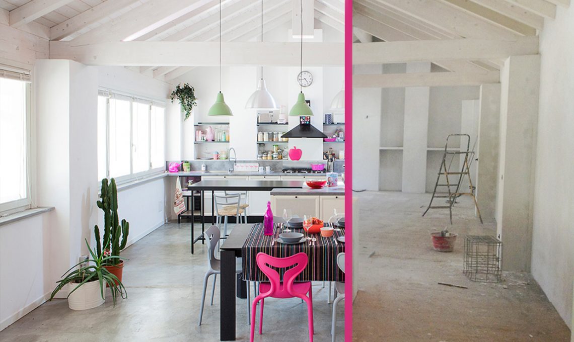Un ex fienile trasformato in casa-atelier: un mix di travi a vista, cemento e colore rosa