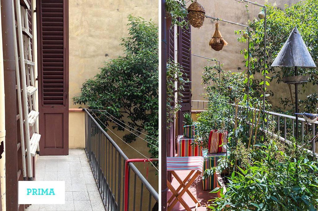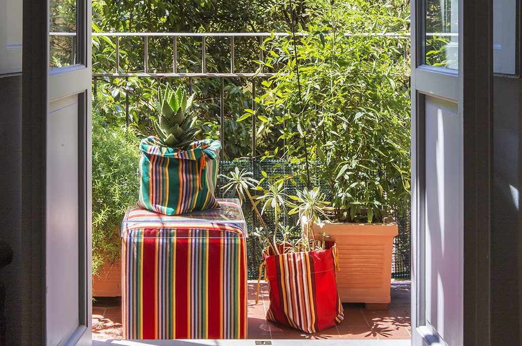 Studio-camera degli ospiti e cucina danno su un balcone lungo e stretto riempito di rampicanti, arbusti e piante raccolte da Rossella durante i viaggi. Cristina l’ha trasformato in dehors con sedute-tavolini in coloratissimi tessuti da outdoor.