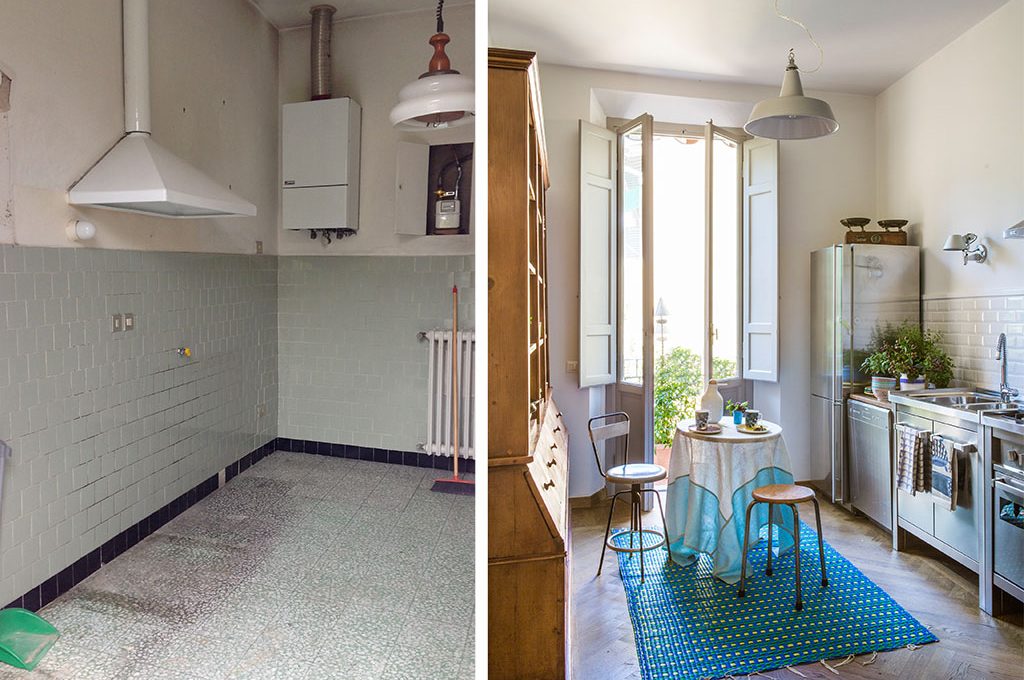 La cucina affaccia su un giardino interno e rispecchia totalmente il mood della casa in continuo equilibrio fra antico e moderno. «Per la zona lavoro ho scelto elettrodomestici e basi in acciaio ‘industriali’. Come mobile contenitore, invece, mi sono innamorata di una piattaia umbra, scovata da un antiquario in piazza dei Ciompi mentre girovagavo alla scoperta della città. E così ho trovato anche il tavolino da bistrot, la sedia girevole e lo sgabello. Cristina ha portato tanto colore con gli accessori!».