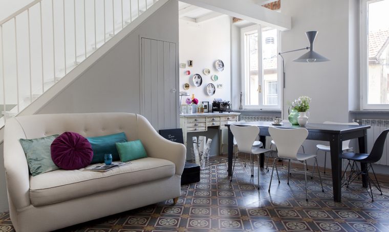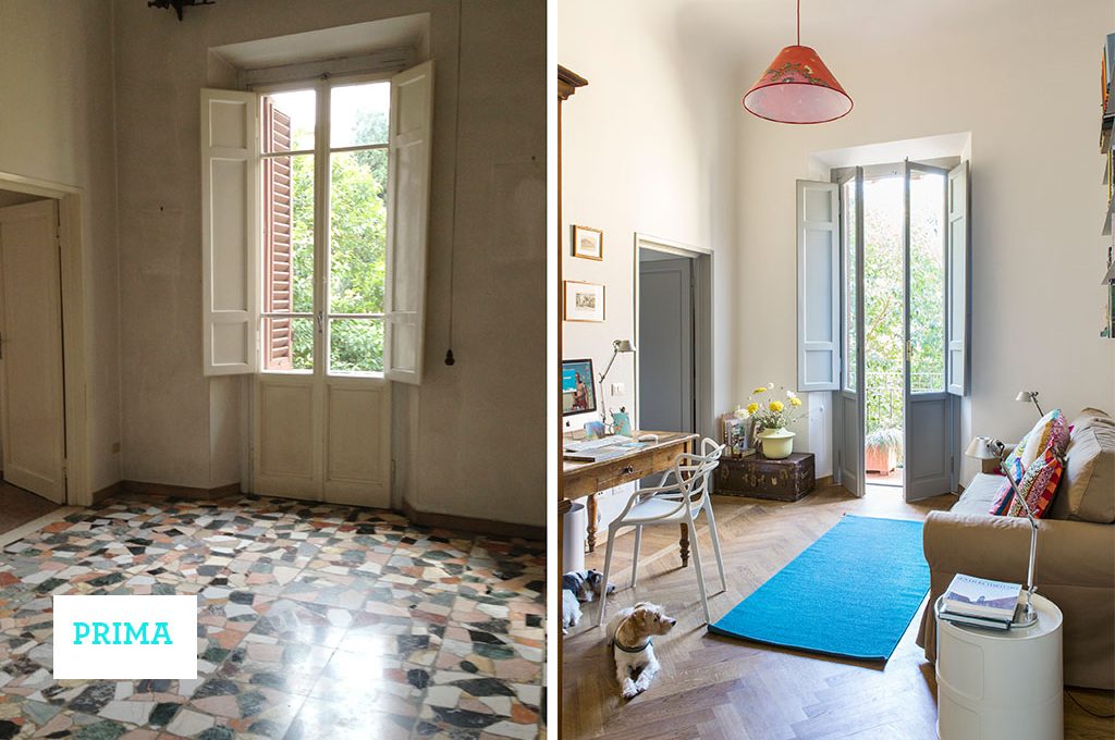 La casa, del 1865, nel 1950 ha subito una ristrutturazione che ha coperto i pavimenti originali in graniglia con marmette diverse in ogni stanza. Rossella ha tenuto la divisione originale dei vari ambienti: solo l’ex guardaroba è diventato un utile secondo bagno, accessibile sia dalla zona giorno sia dalla camera del figlio. Ha posato dappertutto (tranne che in camera di Jacopo, dove ha salvato il pavimento originale) un parquet in rovere a spina di pesce.