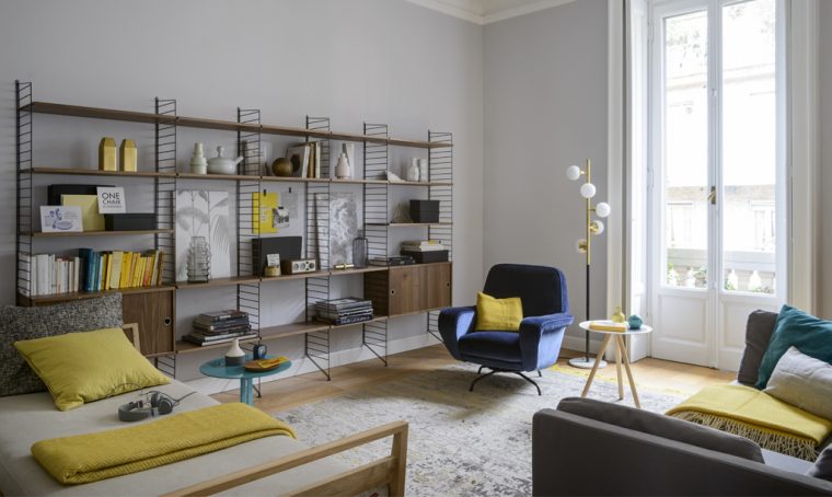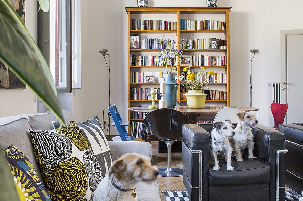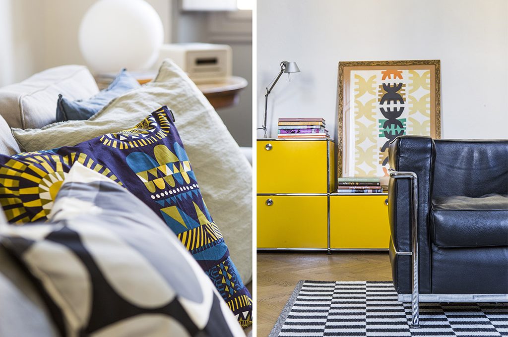 In soggiorno, accanto alla storica poltrona LC2 disegnata da Le Corbusier, il mobile basso Haller componibile e in acciaio verniciato giallo [Usm], colore che riprende quello che spicca sui cuscini del divano.