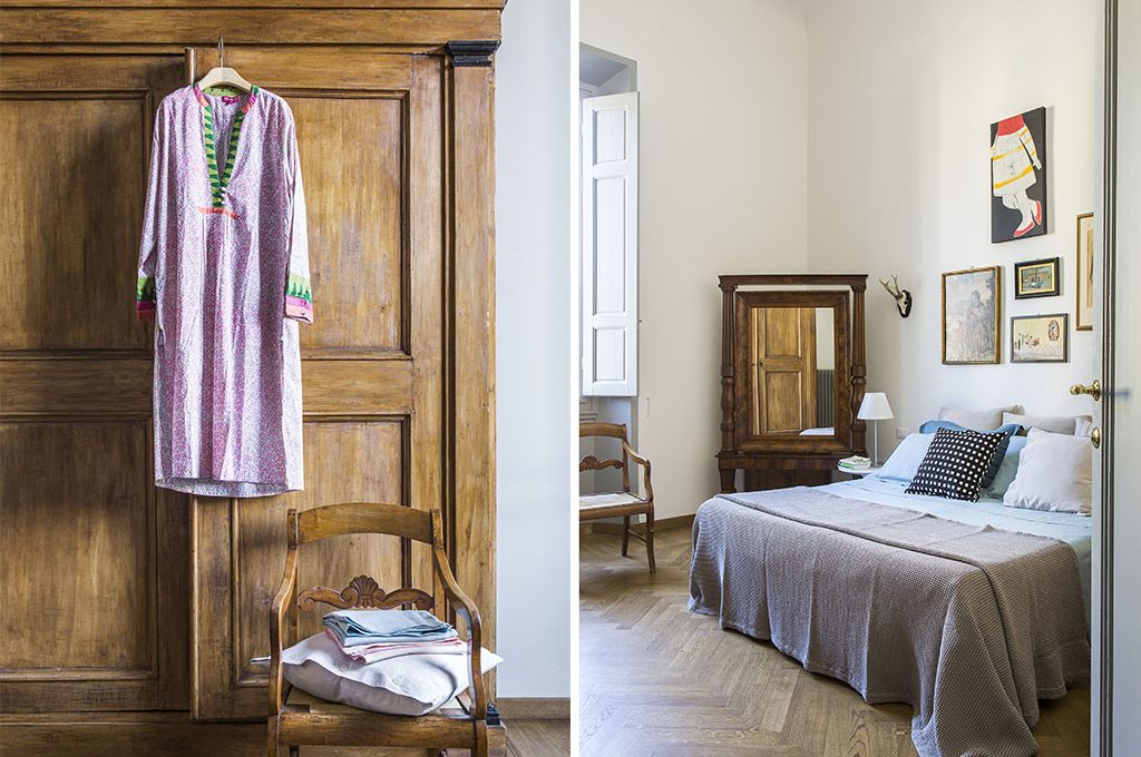 Accanto al letto, con lenzuola Soffio [Fazzini], come comodini ci sono due tavolini Saarinen Side Table [Knoll, Ø cm 41xh €744 l’uno] con lampade Costanzina [Luceplan €187 cad]. All'armadio d'epoca è appeso un vestito di Rossella [Lisa Corti].