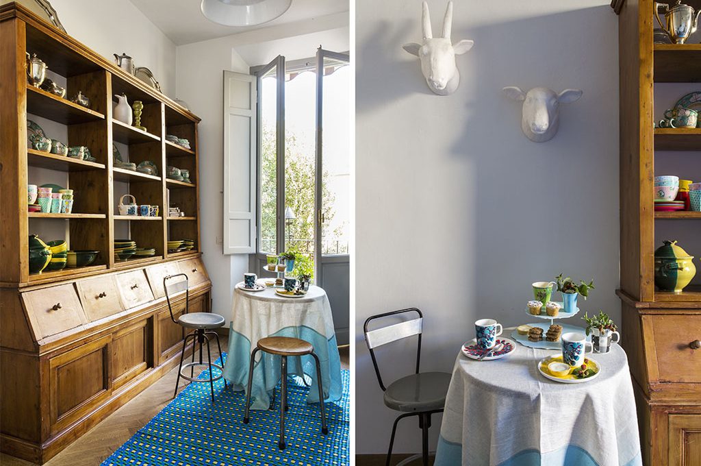 In cucina, di fronte alla zona operativa c'è la madia d’epoca in legno massiccio [Antichità Fabio Innocenti]. Al centro, sul tappeto in plastica intrecciata, acquistato da Rossella in Niger, tavolino, sedia e sgabello vintage comprati da [UB Firenze]. Tovaglia [Lisa Corti], lampada Huna [FontanaArte €242].