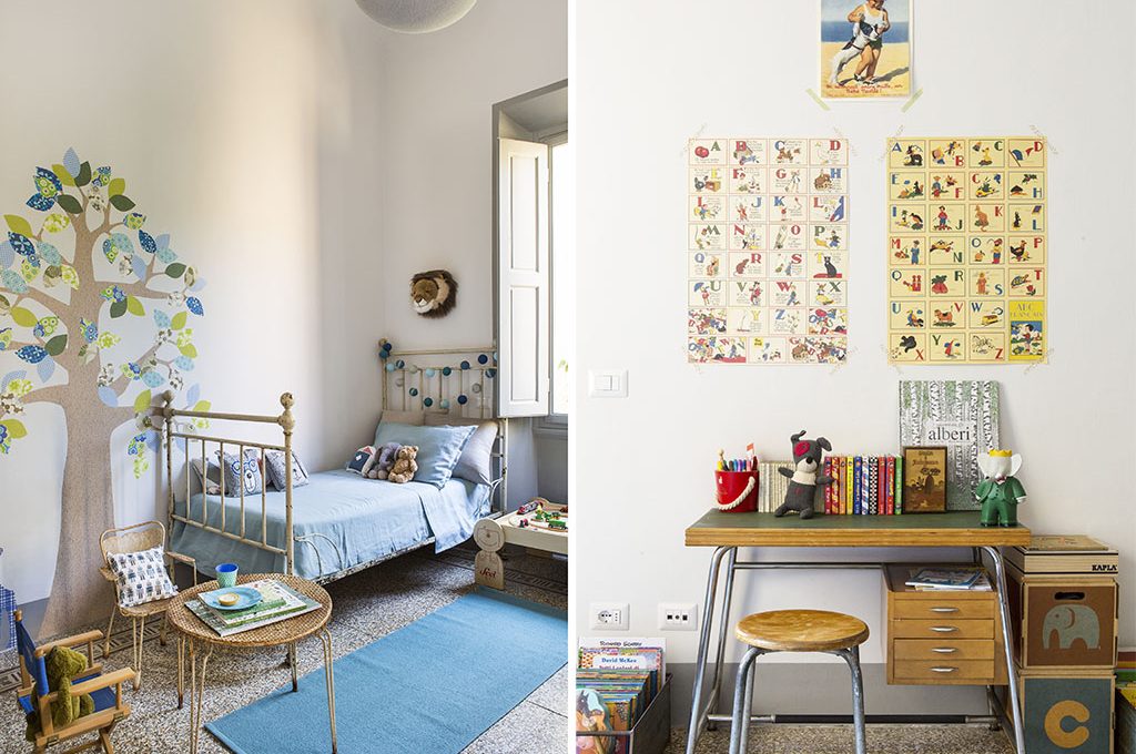 Per la camera di Jacopo, mobili di recupero, d’epoca e da giardino, che volutamente portano i segni del tempo. «Nonostante avessi decorato le pareti con stampe vintage e un trofeo di peluche a forma di leone, l’insieme mi sembrava piuttosto spoglio. Cristina ha pensato alla maxi-sagoma di albero che, tra l’altro, ricorda i rami di quello vero che accarezzano la finestra della stanza. Poi ha dato un tocco di colore con il tappeto.