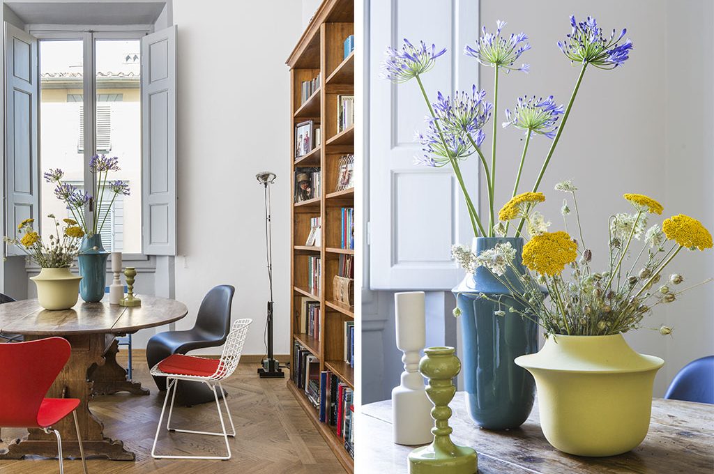 In casa di Rossella, grande esperta ed amante del verde (è lei che cura il nostro VerdeFacile) non possono mai mancare fiori e piante. «Cristina ha sostituito i miei vecchi contenitori per fiori recisi con vasi importanti, disegnati da Sam Baron, dalle texture differenti, ruvide, opache o lucide: moderne sculture che arredano la tavola seguendo la stessa scala cromatica tenue e green dell’ambiente circostante».