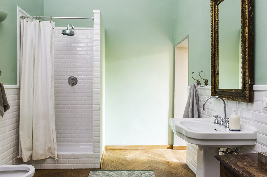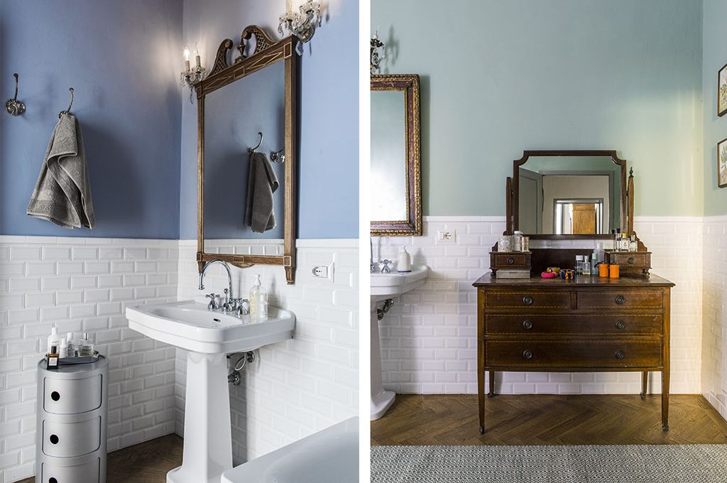Ai bagni, è stato dato un tocco rétro con sanitari vecchio stile e una boiserie di piastrelle diamantate valorizzata dipingendo il resto delle pareti verde salvia (in quello di Rossella) e carta da zucchero (in quello del marito Matteo).