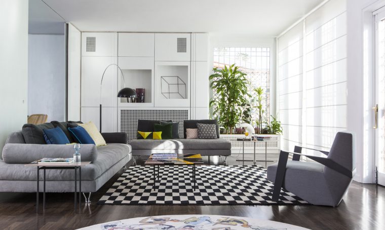 Sui divani grigi ci sono cuscini di ispirazione africana [Marimekko €35 l’uno da Pavart]; a terra, sul tappeto in bianco e nero Arkad 938 [Kasthall, cm 200x290 €2.456] i tavolini Laccio [Knoll, cm 55x48x45h €530 e cm 136x48x34h €878].