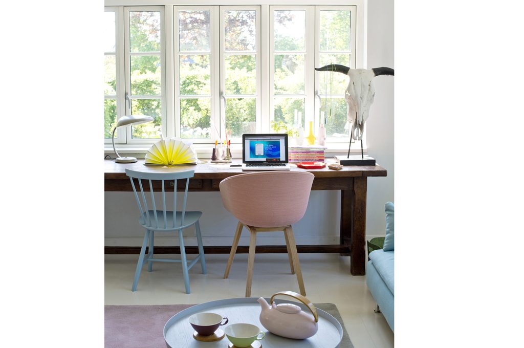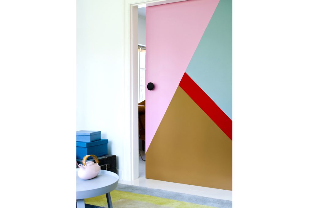 Per dare un tocco femminile alla stanza è stata scelta una palette colori molto trendy: rosa e azzurro. Zona relax: sotto la finestra sono stati sistemati un divano da tre posti (cm 198) azzurro pastello, dei vecchi contenitori di recupero impilati come scatole e bauli, puliti e riverniciati, un maxi tappeto in toni pastello e un tavolino di design grigio polvere. Home office: qui protagonista è il grande tavolo da cucina, mantenuto dalla precedente ambientazione e le due nuove sedute, una di design in tessuto rosa e l'altra, di recupero, acquistata in un mercatino, ripulita e verniciata con uno smalto nel tuo colore preferito! Porta anonima o da rinnovare? Può essere monocolore o con un motivo grafico. Ridipingila tu seguendo tutti gli step sul sito nella sezione fai-da-te e digitando 'Come dipingere una porta'.