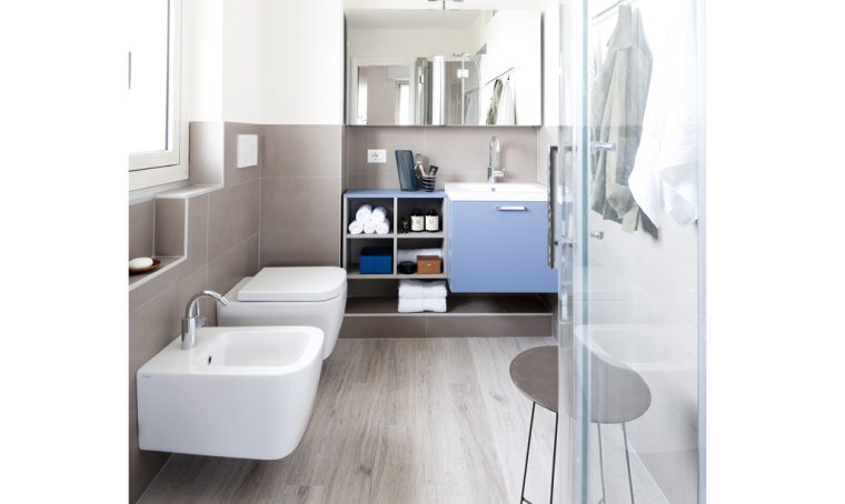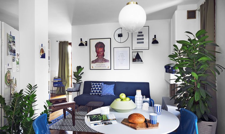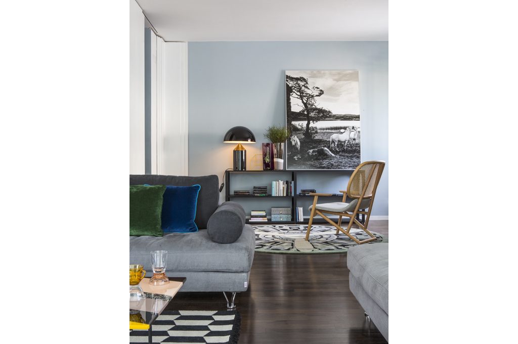 La libreria bassa [Living Divani] lascia spazio all’azzurro della parete, ai pezzi di design, come la lampada Atollo 233 di Vico Magistretti [Oluce, cm 50x70h €1.114], il cubo-scultura di Antonino Sciortino, i vasi [Carlo Moretti] e la fotografia di Marco Monti, coll. ‘Finestre sul mondo’ [cm 170x100 da Mia Home Design Gallery]