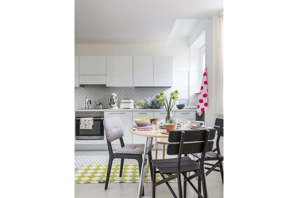 Il gioco di geometrie e grafismi introdotto dalla nostra stylist prosegue anche in cucina e crea un legame stilistico con il resto della casa-set.