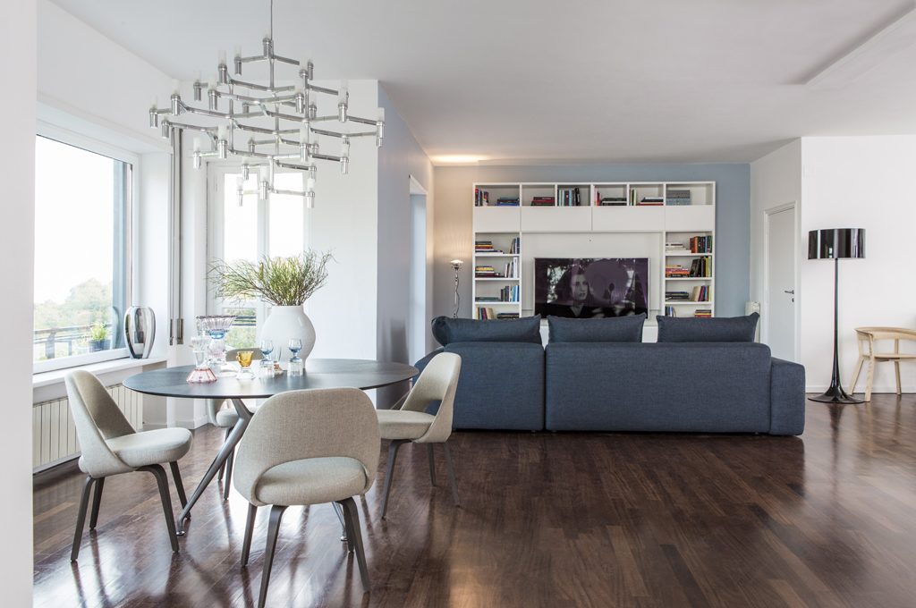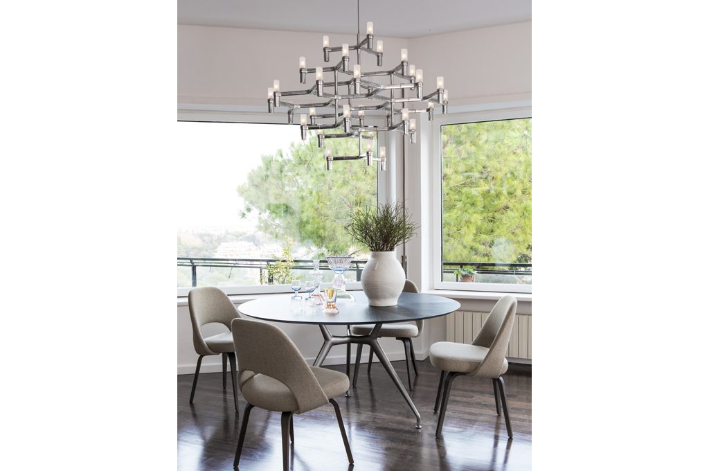 Il tavolo Manta [Rimadesio, ø cm 140x74h €2.189] è stato scelto per inserirsi tra le finestre. Intorno, sedie di Eero Saarinen [Knoll €1.232 l’una] e il lampadario scultura Crown Major [Nemo €2.300], un moderno chandelier. Vasi e cristalli [Mia Home Design Gallery]