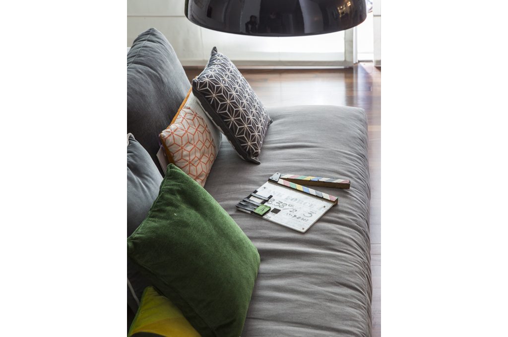 Sul divano reclinabile [Dema], un mix elegantissimo di cuscini [l’Opificio, da €84].