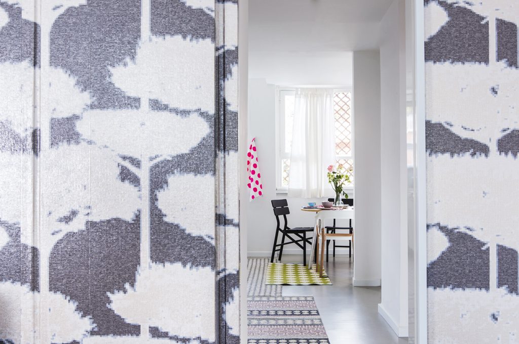 La parete e la porta della cucina sono rivestite da carta da parati in vinile goffrato, che sembra introdurci in un mondo fantastico [Elitis, cm 100h il rollo da 10 m]. Oggi la tendenza è abbinare tappeti diversi per un effetto inedito. Se sono sottili, poi, si sovrappongono facilmente. Qui le stuoie in plastica riciclata di Pappelina, fatte in Svezia [Magazzini Associati]