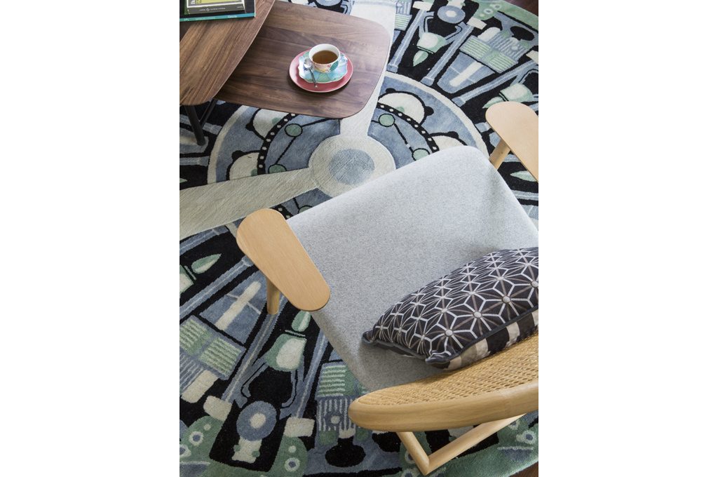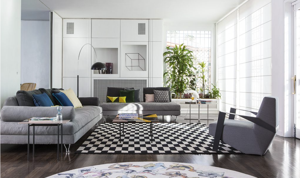 Tappeto optical [CC-Tapis, cm 230x300 €6.210]. Divani reclinabili [Dema], lampada da terra Coupé 3320 di Joe Colombo [Oluce €2.477], poltrona Silver Lake, che richiama il modernismo californiano degli Anni ’50 [Moroso, cm 65x71x84h, da €1.750]. Tavolini: rettangolari Fishbone [Moroso cm 108x68x35h da €570], rotondo Oda [Ligne Roset, cm 100x45h €531], con sopra la lampada Biagio di [Flos]. Tappeto tondo Human Circle Inferno [Nodus Rug].