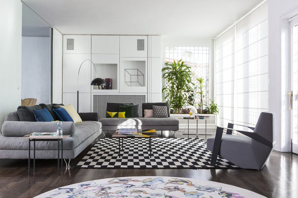 Eccoci nel living, impostato su grafismi a quadretti (anche finestra e griglie sono 'inglobate' nel mobile su misura). Trovi marche e prezzi nel testo sotto