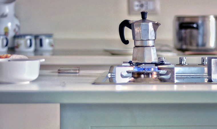 La cucina ha basi e pensili chiusi [Scic]. A terra, grandi piastrelle in grès porcellanato [Casa Mood, cm 60x120]. Il tavolo Déjà-vu [Magis] e quattro sedie abbinate a due a due [Ligne Roset] creano una zona snack comoda e informale. A vista: caffettiera e bollitore [Alessi], robot e tostapane [KitchenAid]