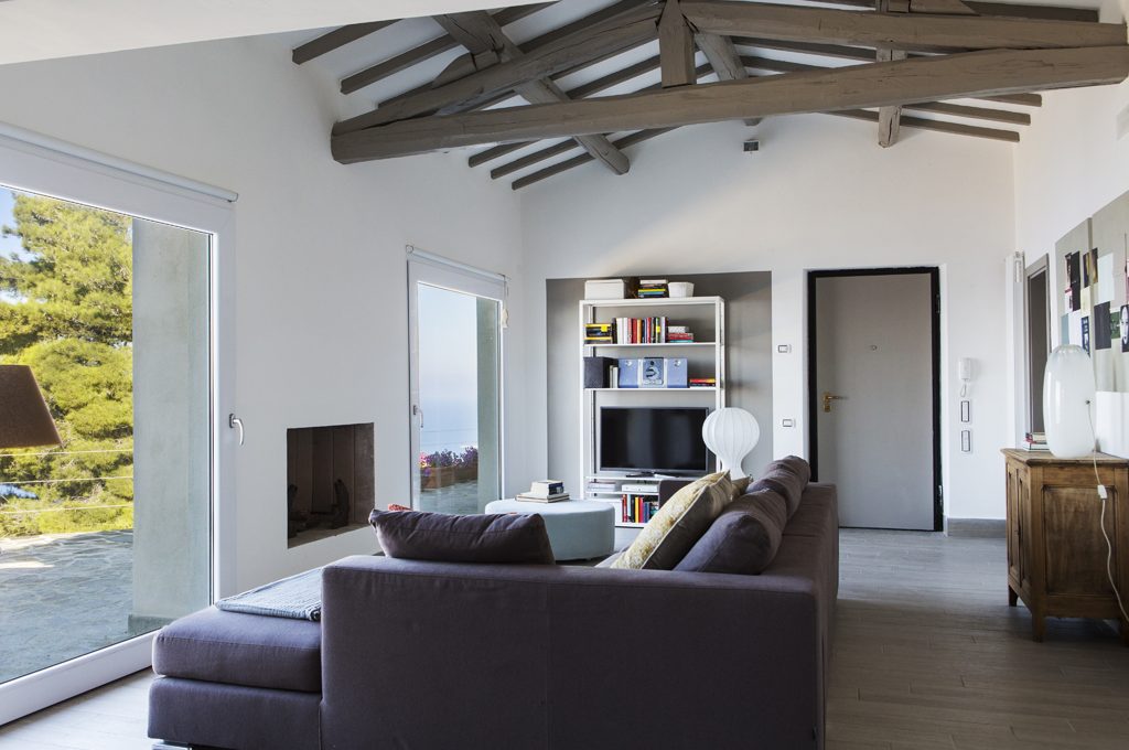 Attraverso le due maxi-finestre che si aprono sul terrazzo della zona giorno, si gode del magnifico panorama sull’arcipelago toscano. Qui davanti è posizionato il sofà Arthur [Jesse, cm 320/213x99x86h €4.331]. Nella nicchia, libreria Fjälkinge [Ikea, cm 118x35x193h €130] con la lampada Gatto [Flos €440].