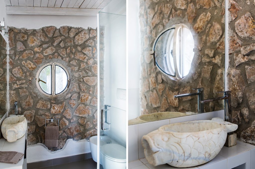 Sostituita la finestra con un modello a oblò, anche i sanitari sono stati variati di posizione. Vaso e bidet sono del tipo monoblocco [Ideal Standard], il lavabo a forma di pesce è opera di un marmista locale, il box doccia ha ante in cristallo. Piastrelle [Marazzi].