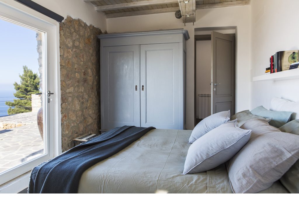 La camera di Gabriella e Fabio è davvero un gioiello: raccolta e intima, gode della spettacolare vista sul mare. Sul letto imbottito Gressvik [Ikea, cm 160x200x100h €289] lenzuola in lino grigio e plaid blu [Society]. Di fianco, un vecchio armadio di famiglia decapato e tinto in azzurro.