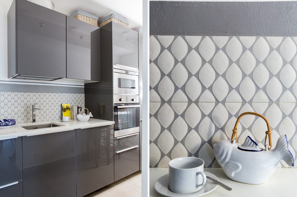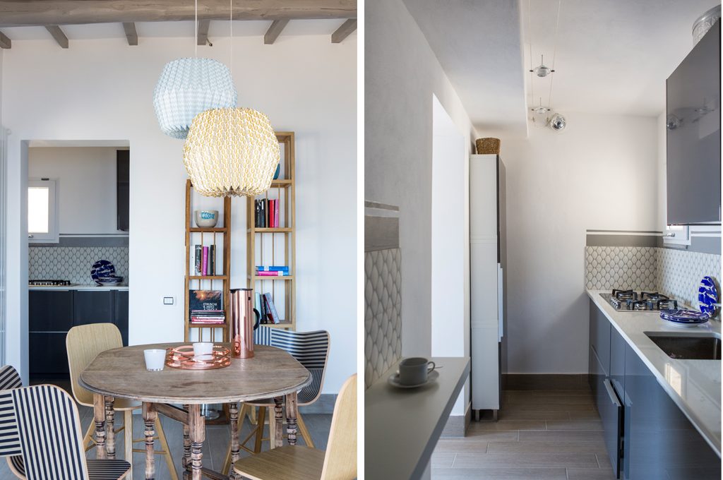 All'antico tavolo inglese di Gabriella Cristina ha accostato sedie di design [Colè da €342] e luci Origami [Atelier Lzc €59 l’una]. La cucina piccola ma funzionale in bianco e grigio e ha il pavimento rivestito in grès effetto legno [Panaria].