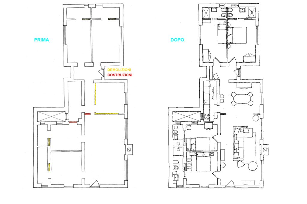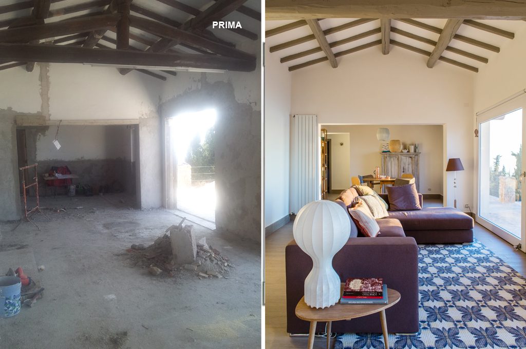 Il living prima e dopo: eliminata la cucina (ora ricollocata sul retro della casa) il soggiorno raddoppia e ospita la zona pranzo. A contrasto con le tinte unite di pareti e divano, i tessili hanno pattern che riprendono le ceramiche toscane come i cuscini [L’Opificio da €71 cad] e il tappeto stampato New Herbarium [Kasthall, cm 195x300 €4.282]. Sullo sfondo, due librerie Totem [Plinio il Giovane da €1.140].