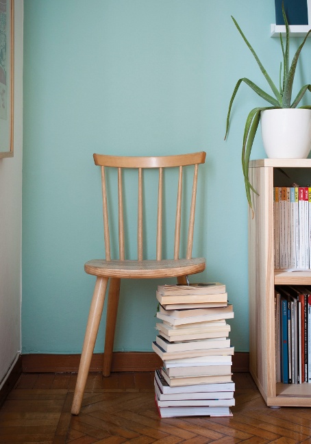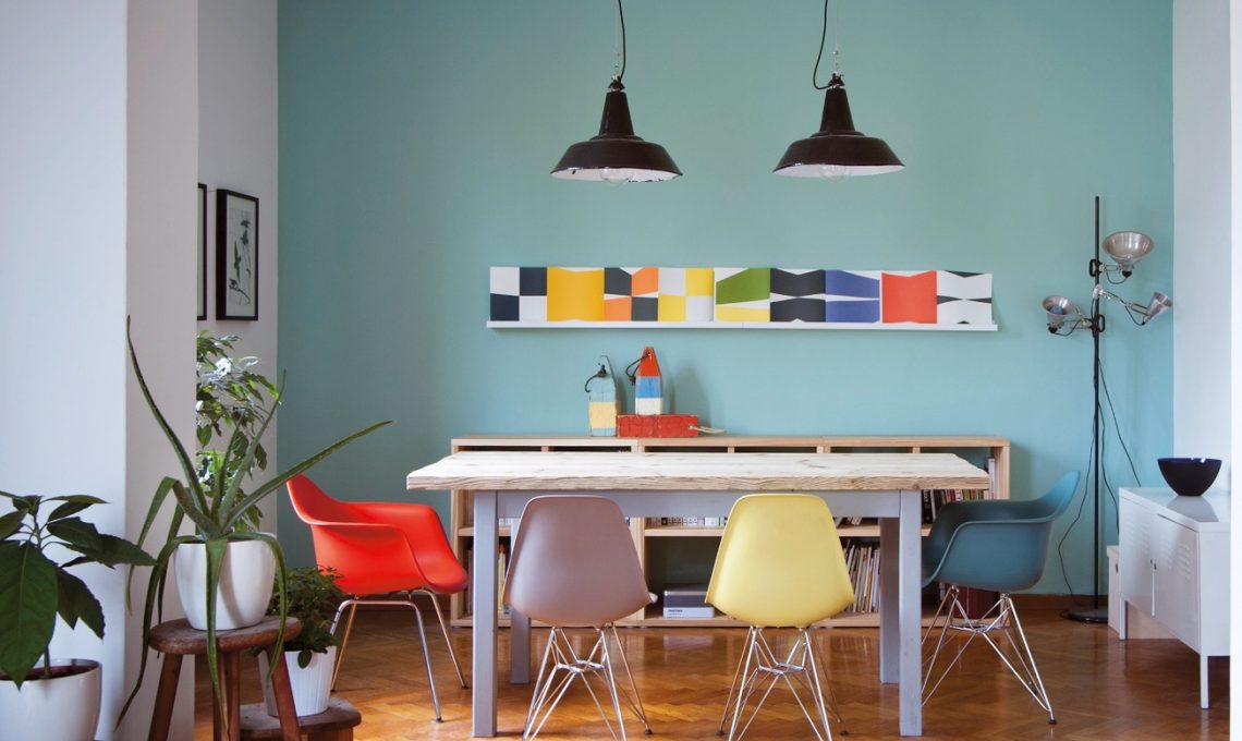 Il soggiorno è luminosissimo e il pavimento è chiaro: con le pareti totalmente bianche l’ambiente risulta quasi fastidioso e allo stesso tempo asettico. Così, sul muro di fondo abbiamo steso una nuance di azzurro che si coordina perfettamente con il parquet e scalda il locale. Quindi, siamo passati al tavolo: dipingendone la base in grigio e rivestendone il piano con grandi assi in massello. Infine, le sedie: le mitiche DAX, DAR e DSR di Vitra in tanti colori diversi. E a soffitto, due sospensioni in stile industriale scovate in un mercatino.