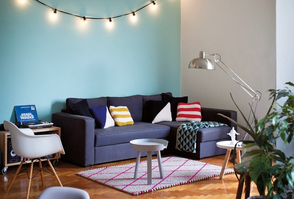La casa di Claudia, Stefano e Andrea è sempre piena di amici: il salotto, dunque, deve essere facilmente liberato per fare spazio. Così abbiamo inserito dei mobili piccoli e facili da spostare come i due tavolini rotondi che hanno sostituito quello esistente, troppo ingombrante. Il divano è rimasto lo stesso ma l’abbiamo rinfrescato con dei cuscini tricot. La parete dietro il sofà, dipinta nello stesso azzurro di quella del pranzo, è perfetta decorata con un filo di lampadine, per un tocco pop.