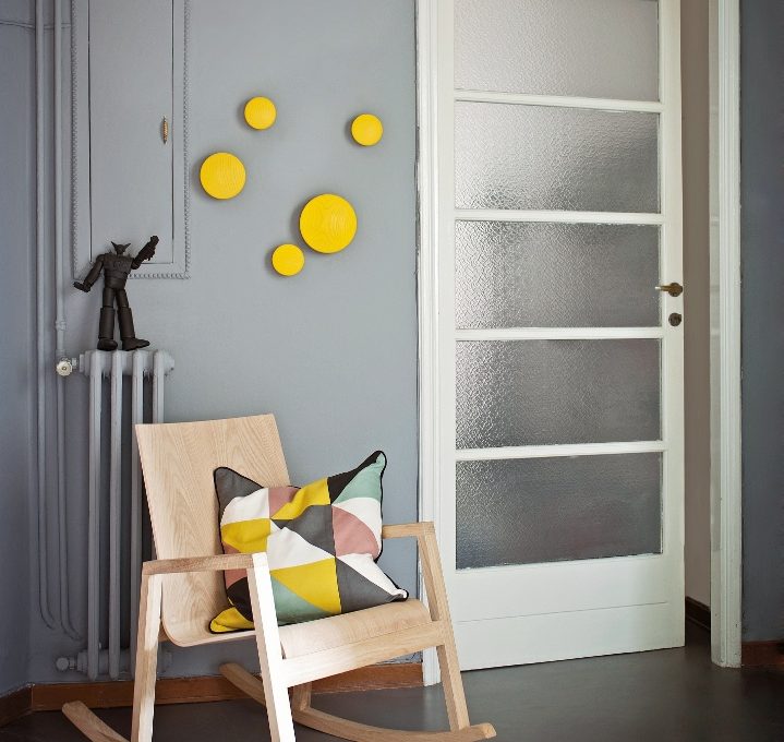 La scelta del grigio scuro per pareti e pavimenti rende l’ambiente uniforme e raffinato. Per personalizzarlo ulteriormente, in linea con lo stile easy living dei suoi abitanti, la zona accanto alla porta d’ingresso è organizzata con una poltroncina a dondolo in rovere curvato, più un cuscino dal décor grafico e con appendiabiti a bolli gialli che, così, spiccano sul muro scuro.