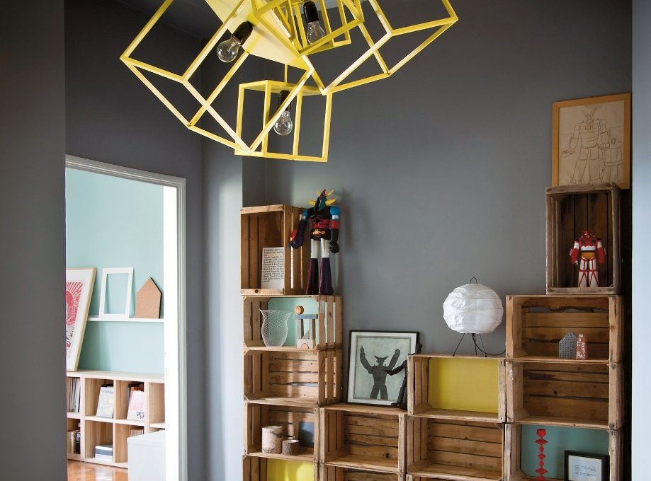 Appena entrati in casa la vista era desolante: una cassettiera da camera con buttato sopra di tutto, abbinata a uno specchio in stile barocco con cornice dorata, recuperato da un antiquario. Così proprio non andava... allora, eliminata la cassettiera e spostato lo specchio di fronte alla porta d’ingresso, abbiamo pensato a una soluzione eco-creativa. In un mercato abbiamo recuperato delle cassette da frutta usate, le abbiamo pulite e rivestite con una vernice protettiva. Quindi, le abbiamo impilate e riempite con pochi elementi: la collezione di Mazinga, qualche vaso, dei quadretti e, in basso, dei libri. E il lampadario? Anche quello l’abbiamo fatto noi: con delle “scatole luminose” giallo sole.