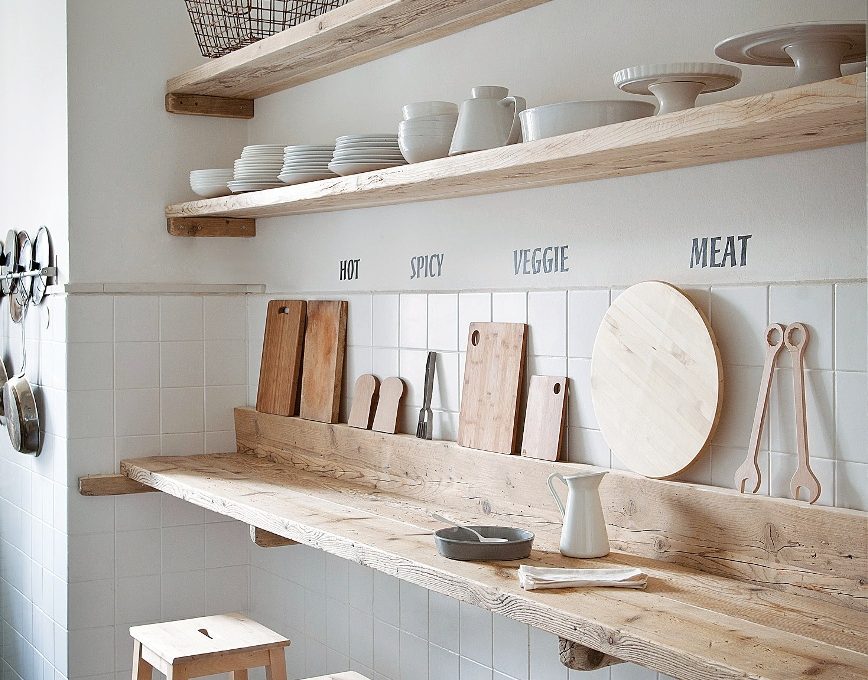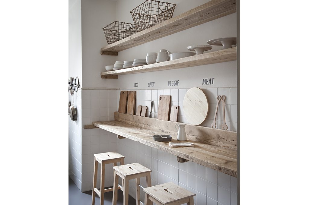 Nella maxi-nicchia, sul lato destro della cucina, c’era un tavolino che, a conti fatti, risultava ingombrante e poco utile per preparare i cibi. Al suo posto abbiamo creato un lungo piano di appoggio lavoro-colazione formato da vecchie assi da ponteggio (resistentissime) recuperate, pulite e sabbiate e, infine, lucidate. Due sono in orizzontale e una in verticale per creare lo spessore sul quale appoggiare i taglieri. Pensato per poter lavorare in piedi e spostarsi facilmente al piano cottura o al lavello (per i ragazzi è il modo migliore di cucinare), quando è ora di pranzo basta estrarre gli sgabelli (nella medesima essenza) da sotto il top.