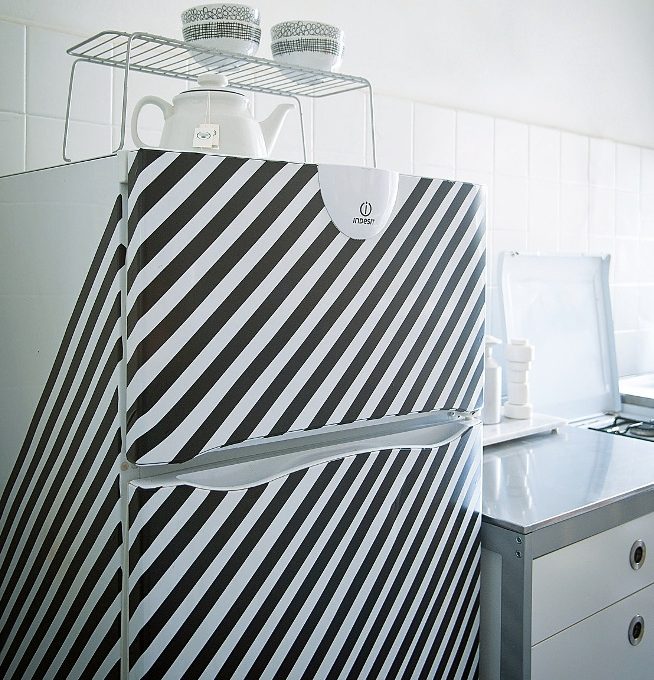 La cucina, come il resto della casa, è stata completamente rinnovata nell’aspetto, ma anche nella praticità di utilizzo, con tanti piccoli interventi molto economici e, soprattutto reversibili (così il giorno in cui i ragazzi decidessero di trasferirsi, riportare l’appartamento allo stato originale sarà facile). Qui, per esempio, proprio come in ingresso, a terra è stato posato il linoleum perché è molto resistente e semplice da pulire. Ma il tocco speciale è sicuramente dato dal frigorifero: delle righe oblique realizzate con il nastro isolante nero lo hanno reso un pezzo unico.