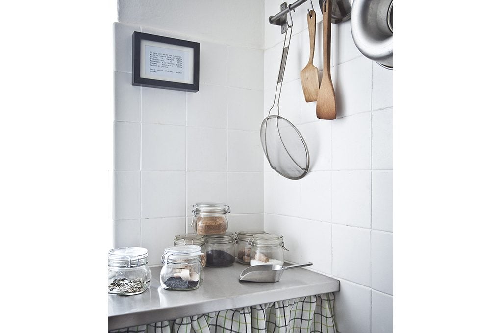 Per sfruttare al massimo lo spazio, abbiamo organizzato a elle la zona operativa della cucina. Il vecchio lavello, rotto, è stato sostituito da un mobile con ampio top in acciaio e lavandino integrato; in più, sotto la finestra è stata fissata una lunga mensola in compensato, rivestita con un foglio in acciaio: ora tutto è funzionale e omogeneo. La tendina sotto il top nasconde il contatore del gas e i bidoni per la raccolta differenziata.