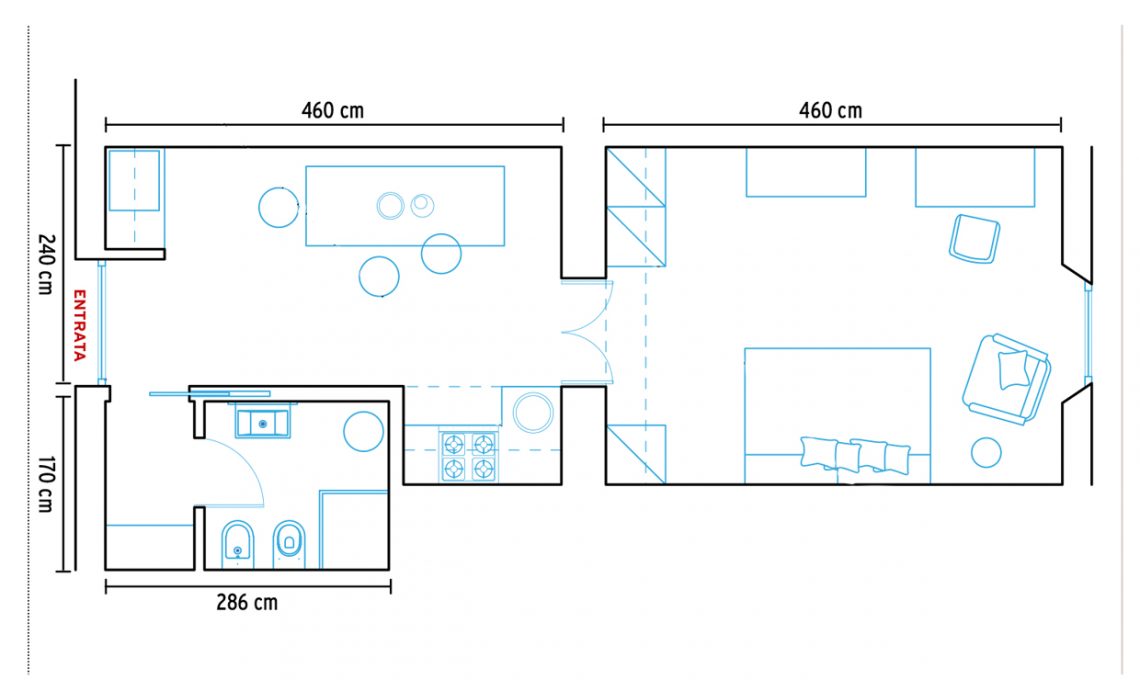 Il piccolo bilocale aveva una stanza d’ingresso che fungeva da zona pranzo con cucinotto a vista, più una grande camera da letto. Ma i proprietari avevano l’esigenza di ricavare un soggiorno dove rilassarsi su un ‘vero’ divano e una zona studio. Così la camera da letto è stata trasformata in living-studio-notte: è bastato girare il letto di 90 gradi perché servisse anche da sofà; l’armadio è stato trasformato in contenitore a ponte sopra la porta, completato da mensole; e c’è un’ampia zona office lungo la parete maggiore. L’altro locale è diventato cucina con sala da pranzo: grazie al tavolo più grande si possono ricevere ospiti, mentre la nicchia-dispensa e due grandi pegboard risolvono lo storage in modo estetico.