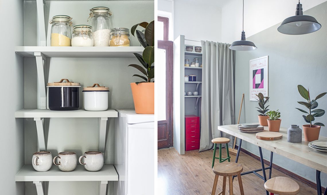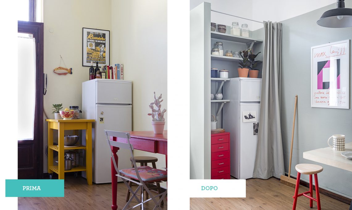 Accanto alla porta d’ingresso è stato ricavato una nicchia chiusa da una tenda che nasconde il frigorifero (che prima era a vista) e la dispensa su mensole.