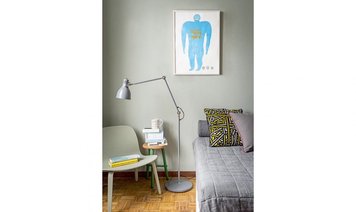 La seconda stanza era utilizzata come camera da letto e la proprietaria di casa non aveva un posto dove poter lavorare. Studiopepe l’ha trasformata in un living-studio-camera: il letto è stato girato di 90° così serve anche da divano ed è stato creato un piccolo home office accanto alla finestra.